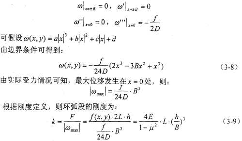 上式為兩端固支的環弧段剛度的計算公式,如將支承邊界條件改為一端簡支和一端固支或兩端簡支,則相應的環弧段剛度為兩端固支剛度75%或50%。由式(3-8)可知,彈性均載環的厚度對其剛度的影響最大;在彈性均載環平均直徑一定時,凸臺尺寸及承載寬度對其剛度有一定影響。