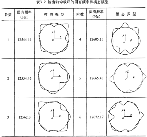 本文利用I-DEAS軟件來進行彈性均載環的動力學分析。首先求解均載環的固有特性問題,在圖3-14所示的均載環的力學模型中,均載環的邊界條件取為均載環的八個外凸臺固支,輸出軸均載環和輸入軸均載環的有限元模型參數同3.5.3,中研究的一致。應用Model草藥Solution模塊中的Model response部分,選用Normal Mode Dynalnics-SVI(普通模態動力分析——同步矢量迭代法)方法求得輸出軸均載環和輸入軸均載環的前六階固有頻率和模態振型分別如表3-2、3-3所示。