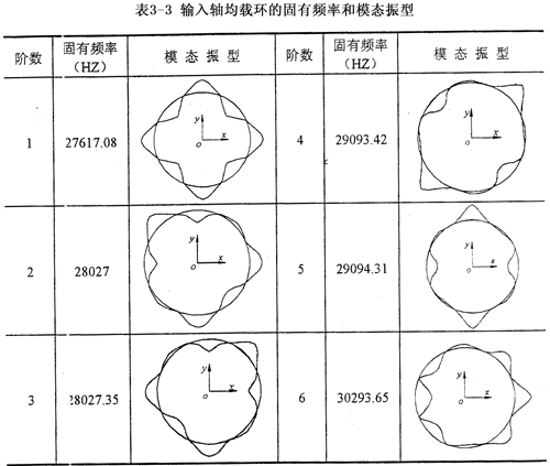 由表3-3可知,輸入軸均載環的前六階固有頻率在2750OHz~30300Hz之間,這些固有頻率遠遠高于三環減速機的轉動頻率和嚙合頻率,三環減速機幾乎沒有發生共振的可能性。本文中的輸入軸均載環由于固定約束點較多而導致它的固有頻率較高。
