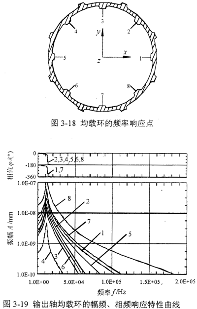 取輸出軸均載環的八個均布內凸臺的中間點作為振動響應點,示意圖如圖3-18所示。取輸出軸均載環系統粘性阻尼系數c=0.03,均載環的邊界條件取為均載環的八個外凸臺固支,輸出軸均載環和輸入軸均載環的有限元模型參數同3.5.3中研究的一致。于是應用I-DEAS分析軟件Model Solution模塊中的Model Response部分,可以求得彈性均載環的暫態激勵幅頻、相頻響應特性曲線如圖3-19。