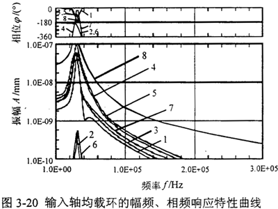 取輸入軸均載環的八個內凸臺的中間點作為振動響應點,示意圖同圖3-18所示。取輸入軸均載環系統粘性阻尼系數c=0.03,均載環的邊界條件取為均載環的八個外凸臺固支,輸出軸均載環和輸入軸均載環的有限元模型參數同3.5.3中研究的一致。于是應用I-DEAS分析軟件Model Solution模塊中的Model Response部分,可以求得輸入軸均載環的暫態激勵幅頻、相頻響應特性曲線如圖3-20所示。
