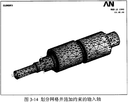 模型采用IGES格式導(dǎo)入,拓撲修補后選擇單元為solid45,指定楊氏模量為2.06×1011N/m2,密度為7800kg/m2,泊松比為0.3。采用自由網(wǎng)格劃分,劃分精度為7 。劃分網(wǎng)格并施加約束的輸入軸見圖3-14。選擇Block Lanczos特征值求解器,指定擴展模態(tài)數(shù)為4,頻率范圍為O~8000Hz。求得輸入軸的前四階固有頻率為2476Hz、2493Hz、3164Hz、3193Hz,對應(yīng)的振型見圖3-15。