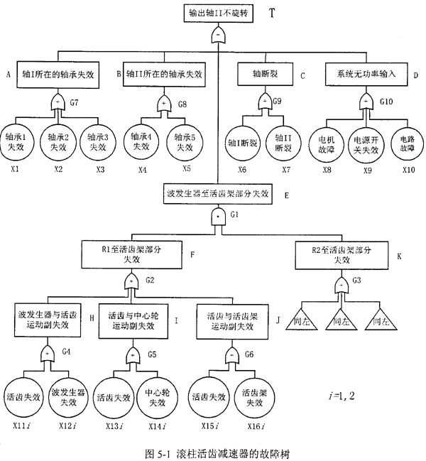在系統(tǒng)可靠性研究方法中,故障樹分析(FTA)是一種用于復(fù)雜系統(tǒng)可靠性和安全性分析的有效方法,它可以全面清晰地反映各種故障原因與系統(tǒng)故障的關(guān)系及每一種可能故障的傳遞途徑,為設(shè)計(jì)、管理和維修復(fù)雜系統(tǒng)提供了一種形象的圖解,指導(dǎo)人們?nèi)ゲ檎蚁到y(tǒng)故障,改進(jìn)和強(qiáng)化系統(tǒng)的關(guān)鍵部分。在己知基本事件可靠性數(shù)據(jù)的基礎(chǔ)上,通過故障樹分析,人們可以快速地找出系統(tǒng)的薄弱環(huán)節(jié),以進(jìn)一步改進(jìn)設(shè)計(jì)和提高關(guān)鍵件的可靠度,從而提高整個(gè)系統(tǒng)的可靠性。本章在分析滾柱活齒減速器系統(tǒng)結(jié)構(gòu)及其功能關(guān)系的基礎(chǔ)上,建立滾柱活齒減速器的故障樹模型,確定系統(tǒng)的最小割集,并根據(jù)建立的故障樹中各事件之間的邏輯關(guān)系以及布爾代數(shù)的運(yùn)算法則,求出滾柱活齒減速器功能破壞即“輸出軸不旋轉(zhuǎn)”這一頂事件的故障概率。