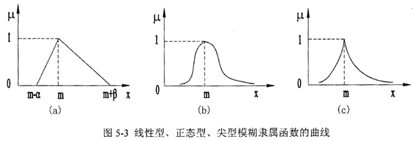 線性型參照函數在“完全屬于”和“完全不屬于”之間的中介狀態是線性變化的(見圖5-3a),當x≤m-α和x≥m+β時,μ=0,說明在(m-α, m+β)區間之外的數值完全不屬于該模數數,而其他類型的隸屬函數曲線兩端延伸到無窮遠(圖5-3b,c),說明整流器個數軸上的任何數總在一定程度上隸屬于該模數數。在選擇參照函數時,除非有絕對的擾握認為該事件發生的概率在某個范圍之間而選擇線性參照函數,否則,以選取正態型或尖型為好。