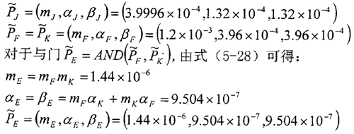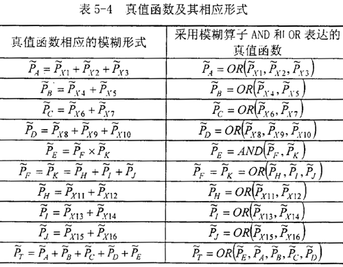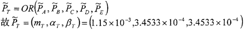 在建立的滾柱活齒減速器故障樹中,用模糊算子AND和OR描述其本事件之間的邏輯關系。生成真值函數的模糊形式及采用模糊算子表達的形式見表5-4。根據模糊數據的運算法則式(5-25)、(5-26)和模糊算子AND和OR的計算方法式(5-28)、(5-30)即可確定頂事件發生的模糊概率。