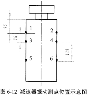 測點布置方案是關系到測量結果的一件重要工作,應選擇信號傳遞路線最短、最能反應減速器振動的部位作為測點。本實驗中測點對稱布置在減速器外殼與活齒中點在同一水平線的兩個點1 、2 上,用以采集第一排活齒引起殼體振動的信號。同樣,測點3 、4 采集第二排活齒引起殼體振動的信號。測點5 、6 布置在輸出軸的支承軸承所對應的殼體位置上,用以測量輸出軸軸承座的徑向振動。各測點的位置示意圖見圖6-12,實際測試時傳感器的位置見圖6-13。