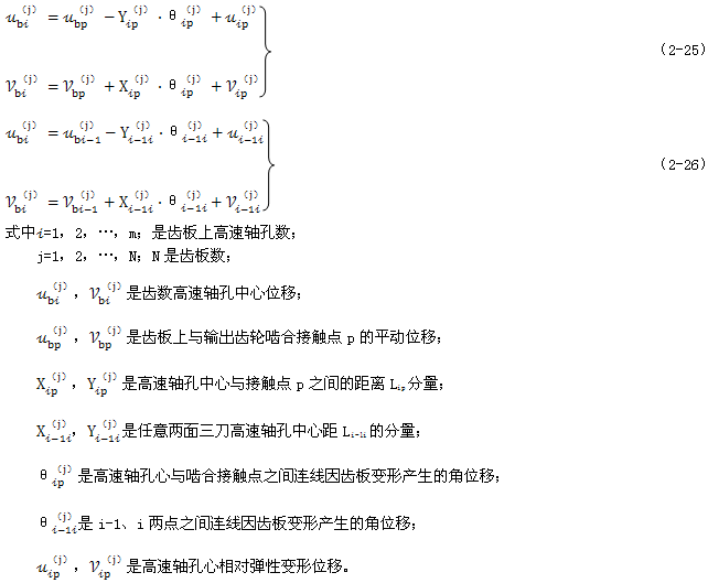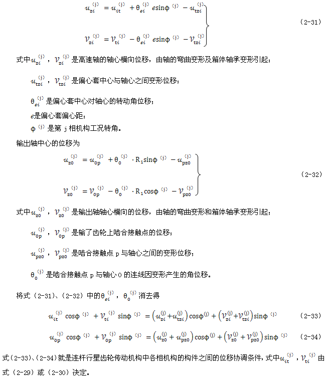 式(2-40)就是少齒差連桿行星齒輪傳動初喲多齒接觸承載的位移協(xié)調(diào)條件。用于多相并列少齒差連桿行星齒輪傳動機構時,由此消去C(j)后可列出Σni=1(Z(j)-1)個補充方程。