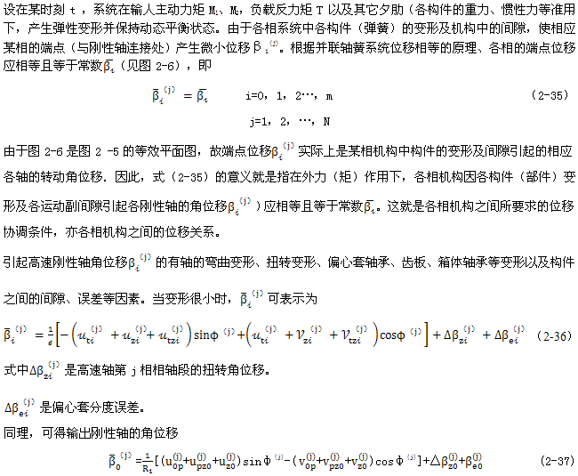 對于連桿行星齒輪傳動機構來說,為了克服機構“死點”,一般是采用多相并列雙曲柄平行四邊形機構或多曲柄平行四邊形機構作為輸入機構的。因此,它是多次靜不定的過約束機構。要完全確定機構的約束動反力,必須尋求與其靜不定次數(shù)相同數(shù)目的位移協(xié)調(diào)補棄方程。過約束機構的靜不定次數(shù)與運動構件數(shù),運動副類型及其數(shù)量等有關。對于少齒差連桿行星齒輪傳動機構,由于接觸承載輪齒對數(shù)因與載荷 大小,機構的運轉工況角的周期函數(shù)。因此,城要增加的機構位移協(xié)調(diào)方程也是工況角的函數(shù)。