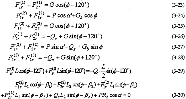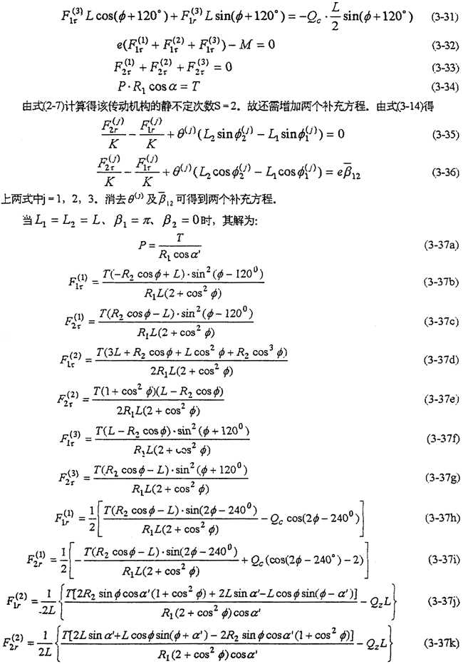 以三相并列雙曲柄機構一齒環內齒行星傳動機構為例(見圖1-3圖3-3),帶行星齒板的雙曲柄機構與另外兩套雙曲柄機構相位差互為120°。疫帶行星齒板轉動的相位角為φ,則另兩相雙曲本機構的相位角為φ-120°及φ+120°由動力分析基本方程,取P(1)=P(3)=0,P(j)=P得