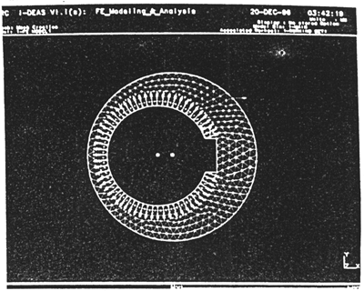 用I-DEAS文件將實(shí)體模型傳輸?shù)接邢拊治鲕浖小T诖藥缀文P偷幕A(chǔ)上,對(duì)外圓周以每360°/5一個(gè)節(jié)點(diǎn)進(jìn)行等分,選用平面三角形單元,自動(dòng)生成如4-2所示的有限元網(wǎng)格圖。