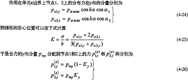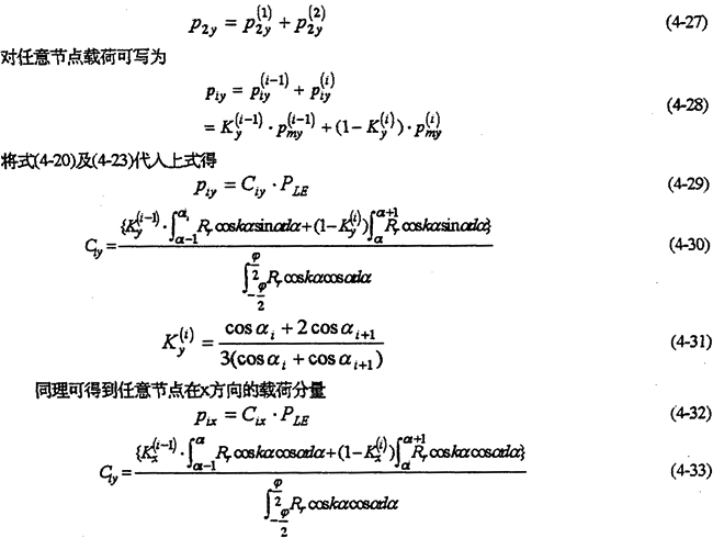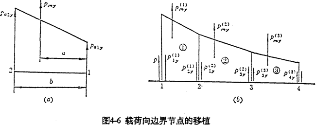 對(duì)于邊界上每一個(gè)微段,按上述方法計(jì)算完后,再對(duì)每一個(gè)邊界點(diǎn)處的力求和即得到邊界節(jié)點(diǎn)沿y向的載荷分量(圖4-6(b))。例如,對(duì)于邊界節(jié)點(diǎn)2,其節(jié)點(diǎn)載荷P2y為