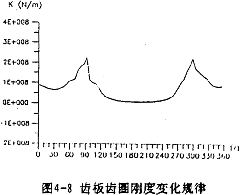 從圖中還可以看到,齒圈厚度較小的范圍(120°~240°)剛度值較小,在180°附近取得最小值,這與40型三環齒板相符。