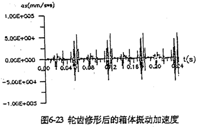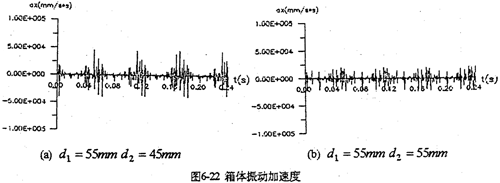 增加高速軸的剛度是降低沖擊載荷的重要途徑。軸的剛度大(值徑大),扭轉、彎曲變形小,雙曲柄機構變形也就小,這樣既減小了沖擊振動、又增加了軸的強度。圖6-22將高速軸的直徑由原來的45mm加到55mm后的,振動加速度圖。