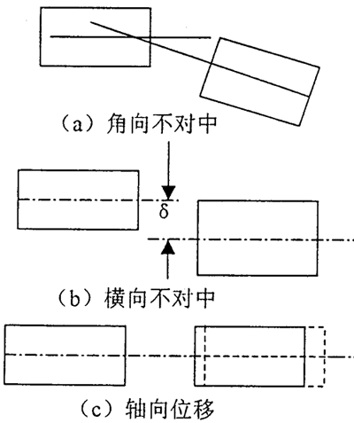 b.橫向不對中情況下,中心線平行但不重合,兩中心線間存在δ距離,最大橫向不對中極限值取決于聯軸器直徑和兩軸端的距離。