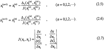方程組(2.4)的求解,實際上是兩條限制曲線交點的求法,如圖(2.2)所示。根據文獻,求點X1和X2,用牛頓法迭代,逐步逼近到交點。其迭代程序如下: