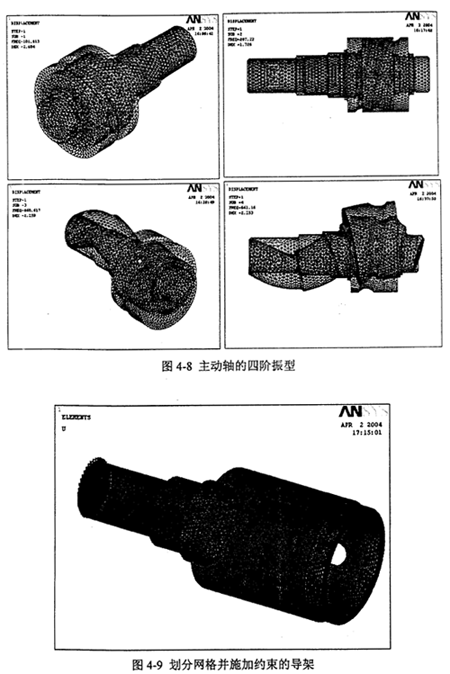 同樣劃分網格并施加約束的輸出軸見圖4-9。求得輸出軸的前四階固有頻率為82.2Hz、265.4Hz、386.2Hz、386.7比,對應的各振型見圖4-10。一階振型為繞z軸扭轉,二階振型為沿z軸軸向拉伸,三階振型為在xoz平面彎曲,四階振型為在yoz平面彎曲。