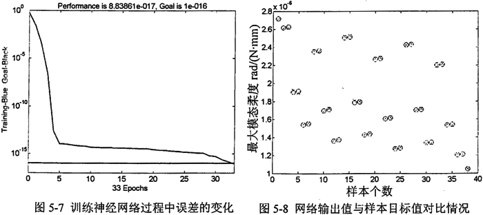 進行動態(tài)優(yōu)化時,若要建立起目標函數,首先要獲得一組能夠精確計算f4(x)的權值,這就需要通過樣本訓練BP神經網絡,當誤差精度達到要求時,訓練停止,并得到了該組權值,利用該組權值與設計變量通過三層BP網絡可以計算出訓練后的分目標函數值f4(x)。在訓練神經網絡時,學習速率取為0.01,動量常數取為0.9,目標誤差取為l×10-16。當訓練結束時,網絡輸出值與樣本目標值之間的誤差均方根值為8.8386×l0-17(見圖5-7),訓練過程誤差的變化情況及訓練完成后網絡輸出值與樣本目標值對比情況如圖5-8所示。
