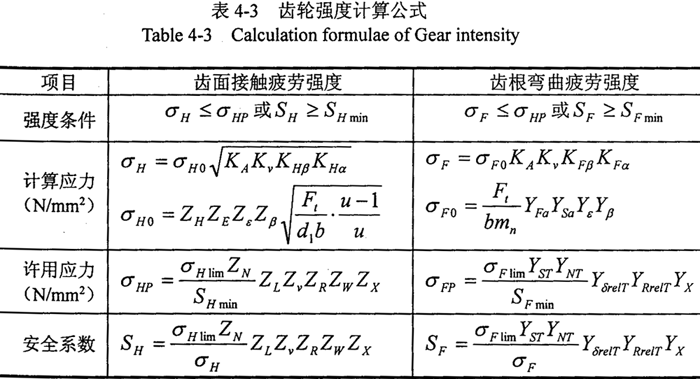 查現(xiàn)代機(jī)械傳動(dòng)手冊(cè)選SHmin=1.5和SFmin=1.5。由于樣機(jī)的內(nèi)齒環(huán)板和輸出外齒輪均選用45號(hào)鋼調(diào)質(zhì)處理,根據(jù)上表提供的有關(guān)公式和樣機(jī)的實(shí)際結(jié)構(gòu)和工況,確定有關(guān)系數(shù)后,通過(guò)計(jì)算有表4-4所示的計(jì)算結(jié)果。