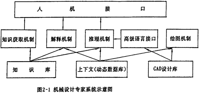 專家系統通常有知識庫、上下文(context)——或稱動態(當前)教據庫、推理機、知識獲取機制、解釋機制、人機接口,對于機械設計系統來說,還有相應的繪圖系統,以及實現調用產品性能分析、優化設什軟件包的與其它高級語言的接口。專家系統結構見圖2-l,其各自的功能分別為: