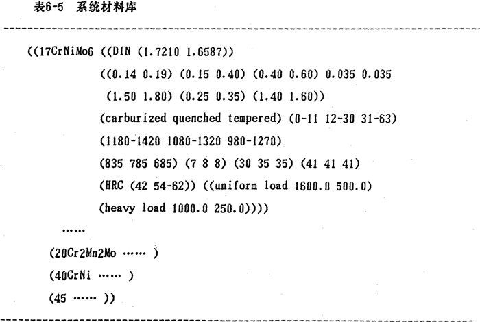軸、箱體以及對大型組裝具輪采用的支撐部分的材料的選擇方法類同于齒輪材料,在此不詳細討論。若當前材料數據庫無可供選擇的材料時,系統便要求用戶輸入指定的材料特性,并按相應的格式加入到材料數據庫,以便不斷地完善系統的材料庫。