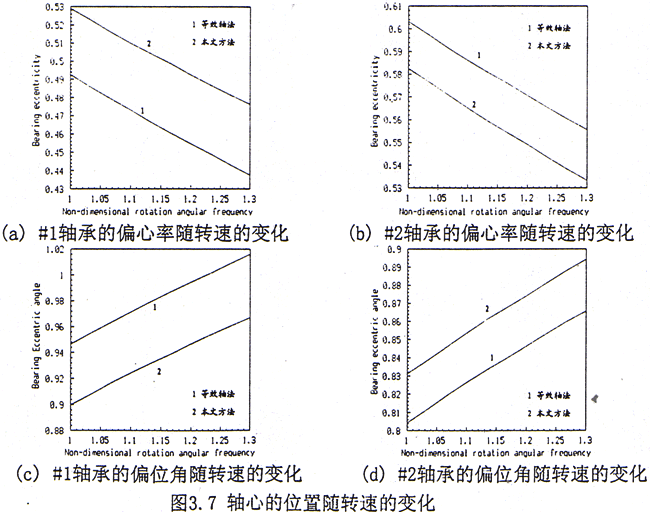 從以上的計算結果來看,用等效軸法計算軸承的軸心位置,#1軸承處的偏心率明顯偏小,偏位角偏大,而在#2軸承處則正相反。這表明采用等效軸法會使轉子的平衡位置產生較大的誤差,也預示著#1軸承和#2軸承之間負荷分配的變化。另外比較#1和#2軸承的結果,還可以看出,聯軸器的作用使得二個軸承的負荷分配趨于接近,而等效軸法從某種意義上講相當于二個轉子的直接對接,必將造成二軸承負荷分配不均,在工作轉速下各軸承處的負荷分配見表3.2,因此對軸承的受力來說這也正是采用齒輪聯軸器的優點所在。從二軸承處的動特性來看,#1軸承的各項剛度和阻尼系數比等效軸法大,而#2軸承的各項剛度和阻尼系數則比等效軸法小,這歸根到底也是軸承負荷分配發生了變化的結果。如果采用單軸分析方法計算,以左側轉子為例,由于聯軸器的質量與圓盤相比要小許多,系統近似為一對稱轉子系統,則作用在#1和#2軸承上的負荷相差不大,因此二個軸承處的動特性系數也比較接近。由于軸承的靜、動特性發生了變化,因此勢必引起系統動態特性的變化。