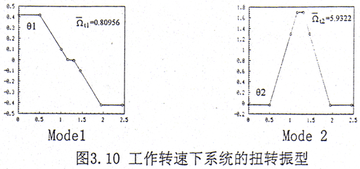 在ka=0.128不計內阻尼時,工作轉速下系統的前12階彎曲振動復模態圖見圖3.9。從復模態圖上可以看出,在低階彎曲模態中,輪齒的變形是較小的,輪齒變形較大主要發生在高階模態中。這與實際情況比較接近,因為在實際的轉子系統中,輪齒的剛度一般比軸段的剛度要大許多,因此在低階的彎曲模態中,輪齒的變形體現不出來。系統前2階的扭轉振型如圖3.10所示。在前二階扭轉振型中輪齒變形也較小。
