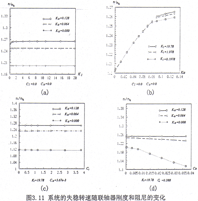 從圖3.11c可見在一定的范圍之內,齒輪聯軸器橫向內阻尼的變化對系統的失穩轉速幾乎沒有影響。由圖3.11d可知,隨齒輪聯軸器轉角內阻尼的增加失穩轉速減小,減少的幅度與系統的轉角剛度有關,轉角剛度取大值時,系統的失穩轉速變化甚微,而取小值時,則變化明顯。一般而言,對于確定的齒輪聯軸器類型,如果輪齒間的潤滑充分對中良好,則轉角內阻尼變化不會太大。所以系統的失穩轉速也不會有明顯的變化。但當潤滑不充分,齒輪聯軸器對中不良時,轉角內阻尼的變化較大,從而會引起系統失穩轉速生產較大的變化。