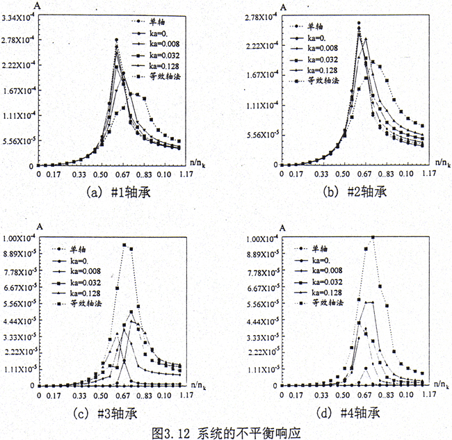 用單軸分析法計算不平衡響應,在#1和#2軸承上產生的振幅最大,等效軸法則最小,而在#3軸承和#4軸承上產生的振幅則正相反。其中用單軸分析法計算不平衡響應,在#3和#4軸承處不產生振動,這與實際情況不符;用等效軸法計算,則明顯夸大了二側轉子的耦合作用,沒有體現出齒輪聯軸器的特點。因此采用單軸分析方法和等效軸方法計算系統的不平衡響應均存在不小的誤差。通過上面的計算可見,隨著轉角剛度的增大,左側轉子的不平衡量對本身轉子支承軸承所激起的響應幅值明顯減小,對右側轉子支承軸承所激起的響應幅值則明顯增大。