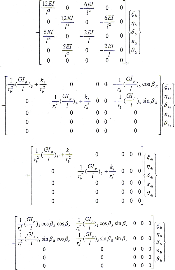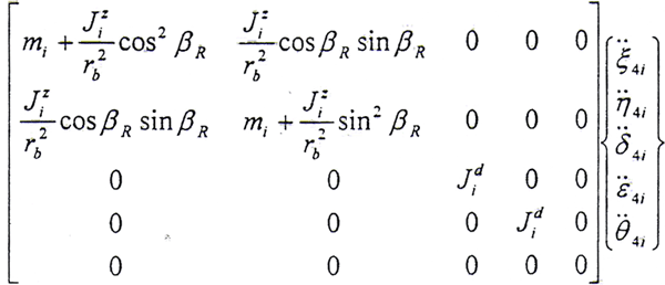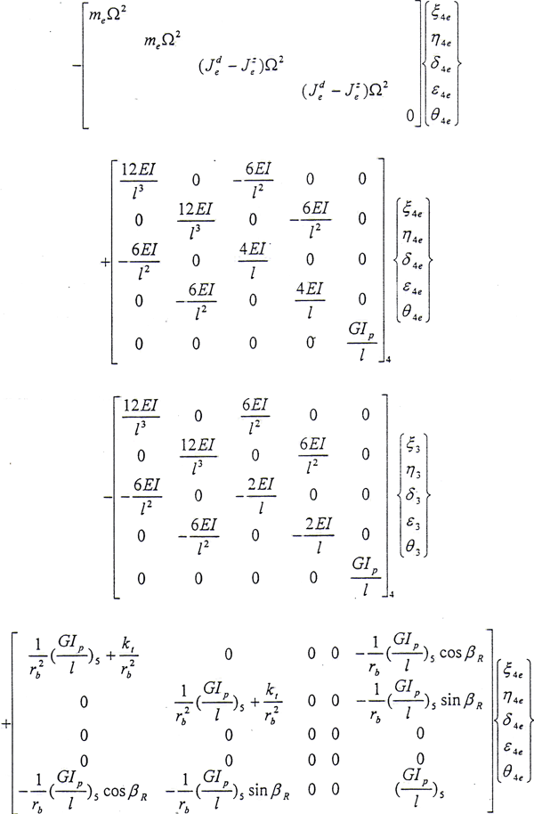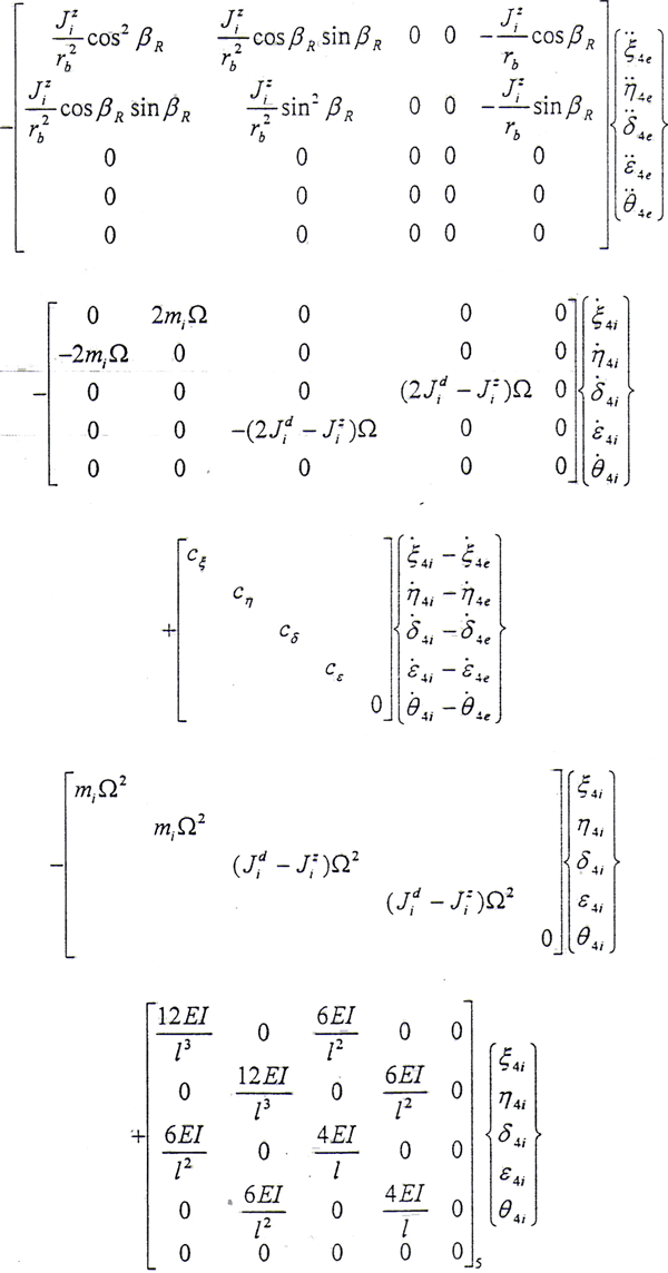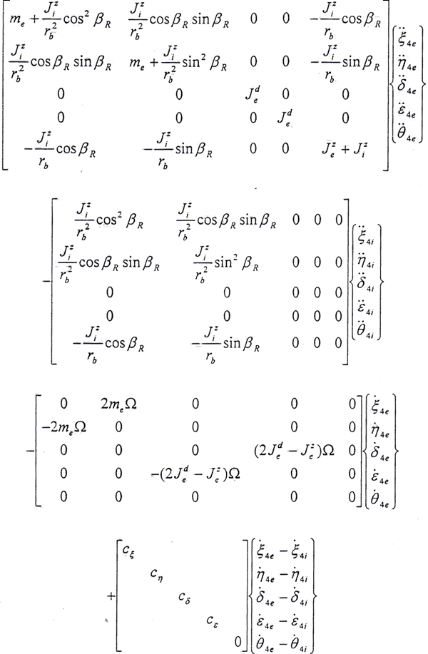 在式(5.27)和式(5.28)中,由于包含了θj+1(即為圖5.5中的θ5i)。而θ5i又必須要滿足以上的約束關(guān)系,所以可以想象在考慮了二個(gè)半聯(lián)軸器后,耦合關(guān)系更為復(fù)雜。但處理的方法是類(lèi)同的,具體過(guò)程在此不再重復(fù)了。整個(gè)系統(tǒng)有8個(gè)結(jié)點(diǎn),共48個(gè)自由度。下面僅列出結(jié)點(diǎn)4處的運(yùn)動(dòng)微分方程。