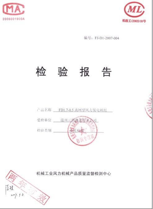發證機構:機械工業風力機械產品質量監督檢測中心